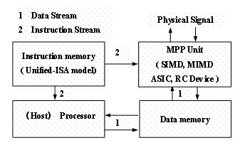 具體對指令流體系結(jié)構(gòu)來說,其SISD、SIMD、MISD、MIMD四類體系結(jié)構(gòu)的指令子集合是統(tǒng)一成SISD體系結(jié)構(gòu)的指令集合,對于數(shù)據(jù)流與構(gòu)令流的體系結(jié)構(gòu)是通過增加相應的指令,統(tǒng)一成SISD體系結(jié)構(gòu)的指令集合的;換句話說,圖1中的SIMD、MIMD、ASIC與RC Device四種 MPP Unit都是可以通過軟構(gòu)件描述的。這些軟構(gòu)件是可以在SIMD或MIMD體系結(jié)構(gòu)上直接執(zhí)行的,或者是可以自動映射成ASIC或RC Device電路的。(2)虛擬的并行計算陣列